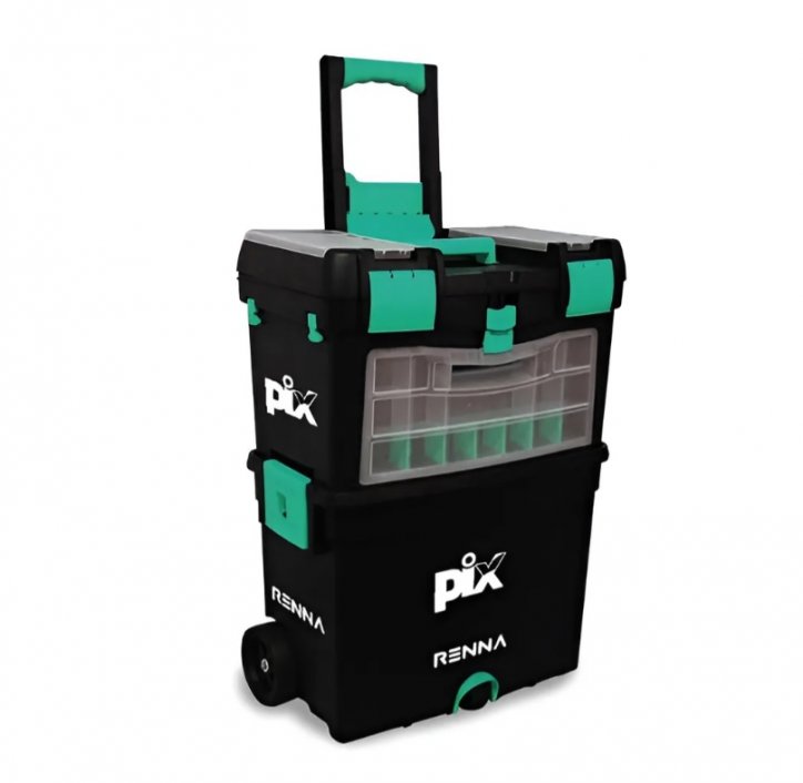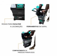 Possui 3 rodas e haste para movimentação.