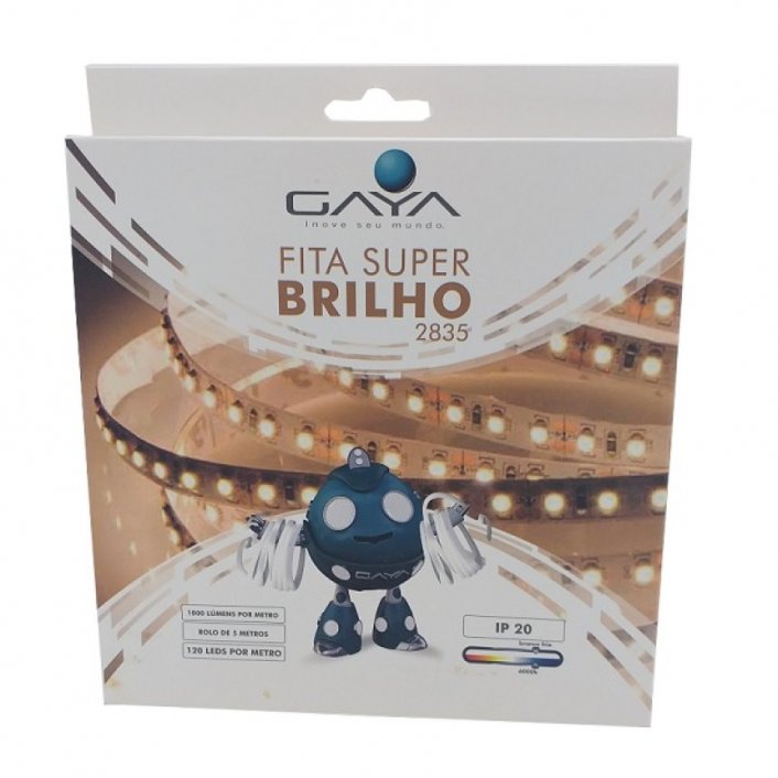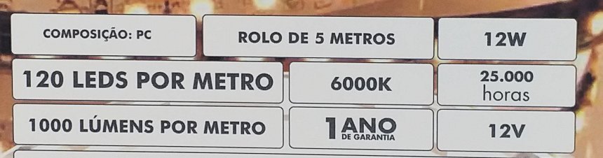 Potência: 12W Temp. de Cor: 6.000K Fluxo Luminoso: 1.000lm/m LED: 120LEDS/m Grau de Proteção: IP20 Dimerização: Não dimerizável Vída Útil (L70): 25.000h Largura da Fita: 8mm Corte da Fita a cada 2,5cm Composição: PC