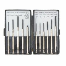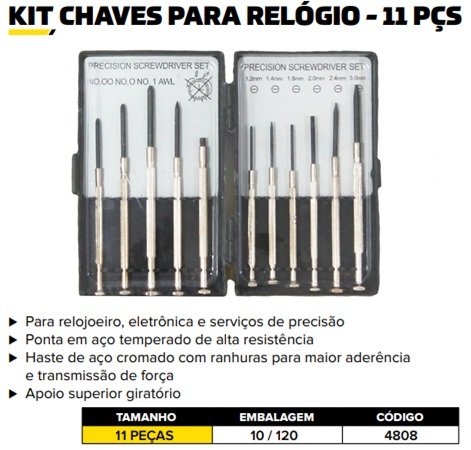 Para relojoeiro, eletrônica e servicos de precisão. Ponta em aço temperado de alta resistência. Haste de aço cromado com ranhuras para maior aderência e transmissão de força. Apoio superior giratório Conjunto com 11 peças.