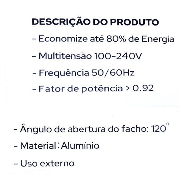 Potência: 150W Tensão: 100-240V Frequência: 50/60Hz Temp. de Cor: 6.500K Fluxo Luminoso: 15.000lm Ângulo de Abertura: 120° Fator de Potência: ≥0.92 Grau de Proteção: IP65 Dimensões: 469 x 151 x 54mm Material: Alumínio e vidro