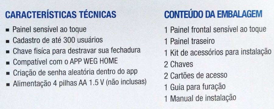 - Segurança Reforçada: Equipada com alarmes anti-violação e sistema de travamento automático, a fechadura WEG garante a tranquilidade que você e sua família merecem.