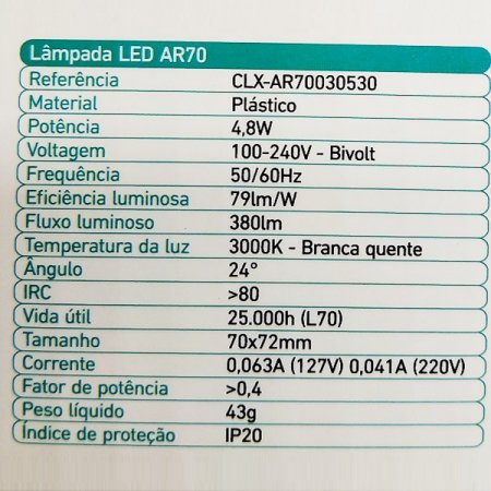 Lâmpada led AR70 GU10 4,8w 3000k 380lm 24º-Cristallux