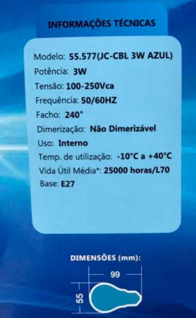 Lâmpada led bulbo 3w azul -Jng (c/10)