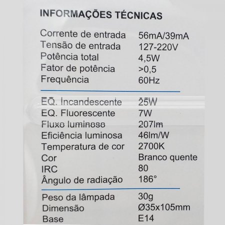 Lâmpada led vela clara 4,5w 2700k 225lm biv E14-Luminatti