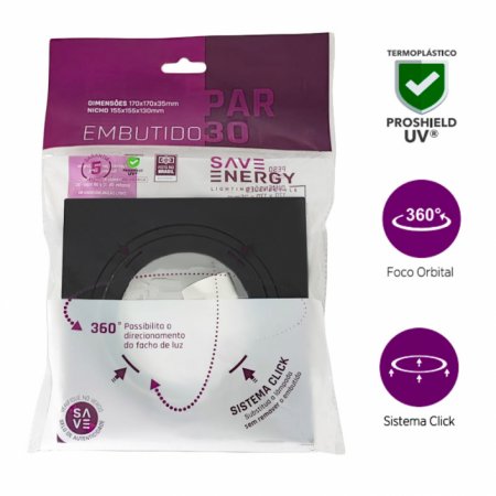 Spot embutir quadrado recuado clic mv p/PAR30 preto ABS-Saveenergy