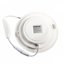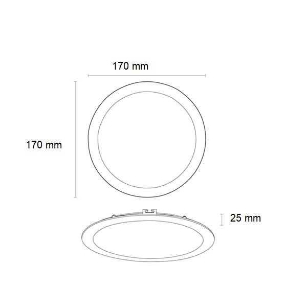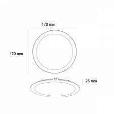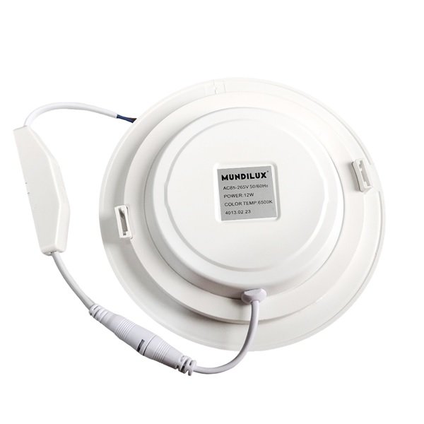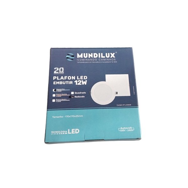 Potência: 12W. Fluxo luminoso: 1080 lúmens (lm). Temperatura de cor: 6500K (Branco Frio). Diâmetro: 17cm. Material da estrutura: ABS. Tensão: Bivolt (AC 110V-220V). Formato: Redondo. Tipo de instalação: Embutir.