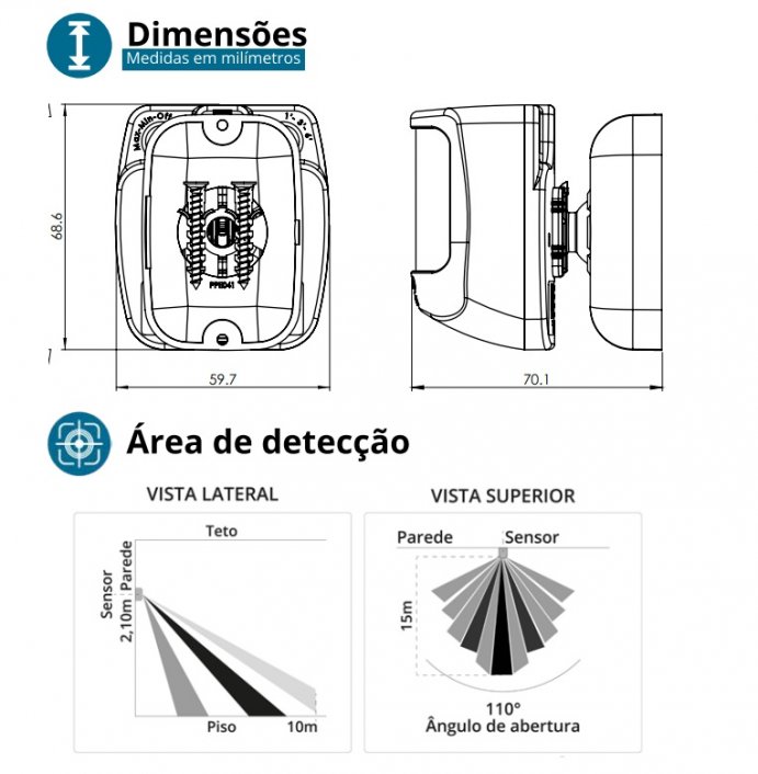 • Cobertura: 110° com alcance de até 15m na temperatura ambiente de 25ºC, em uma altura de 2,1m;