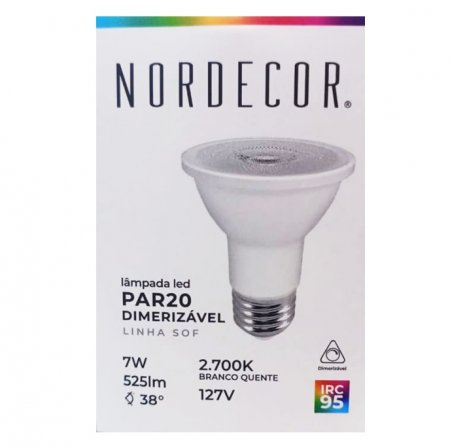 Lâmpada led PAR20 dimerizável sof 7w 2700k 525lm IP20 38º IRC95 127v-Nordecor